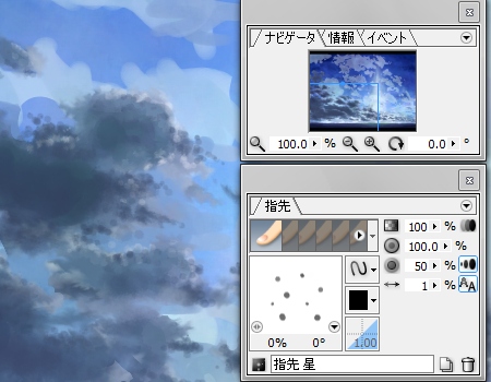 前回、おおまかに描いた雲のレイヤの不透明度を50%くらいに下げて、